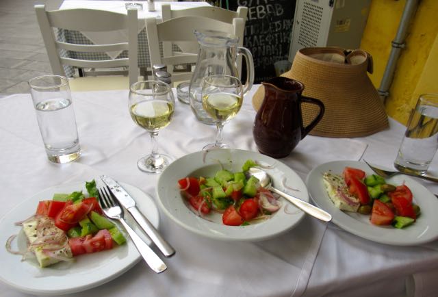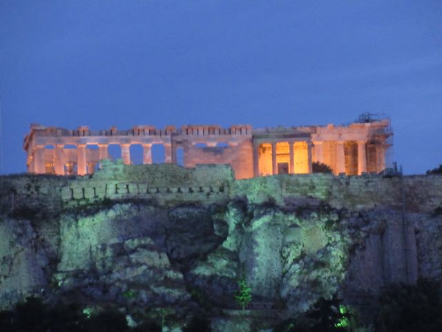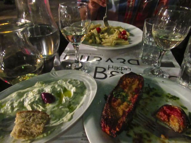 We stayed and visited with our new friends for a bit and then it was time to move on and find some dinner. It just wasn’t coming together as we walked the nearby streets.  Not many restaurants in the area appealed to us as there were few patrons inside.  We looked for a cab to get back to our street with all the wonderful restaurants.  We walked and walked and no taxis.  Finally one came by and he chatted non stop about his visits to Canada, etc. Thanks for the ride, we got out and where the heck were we.  He dropped us off at least a dozen blocks away.  We did make it back and first thing I said to our girl who recognized us from a few nights ago, was wine ASAP.  Colin had pasta, I had the eggplant and treated myself to the 4.5 Euro dish of overpriced tsatsiki ,but I just had to taste it because it was actually made here in Greece.  So very rich and garlicky.  It was our latest meal ever and @ 11;45PM I could not eat much.  It all came home for lunch the next day. Photo by me.