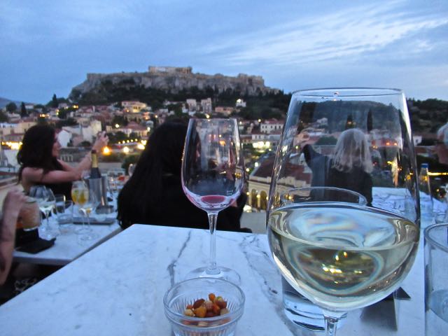 Shortly after 7:30 PM we took a taxi to that tall building, A is for Athens. We were here to see the sunset and the lights come on at the Acropolis.  Sadly they said we needed a reservation.  I countered with the story that a local ( our tour guide Alex ) said that they did not take reservations.  We already had decided to come here based on my research and I should have followed my gut and called.  Long story short I talked us into being allowed to come up to the roof top viewing area as long as we stood.  Fine by us.  We ordered a drink and had not taken more than two small sips ( expensive wine ) when we were offered a table to sit at.  Someone had left.  Perfect.  I did feel badly for the two other couples who left as they had no reservation.  I never take no for an answer.