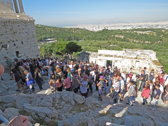During our free tour yesterday Alex mentioned that today, Saturday the 18th was National Museum Day and all the museums would be free. However that meant being in line to see the Acropolis before 8AM.  We were there and here we are going up the multiple slippery marble steps.  I actually wore my runners for this one.  Not only did we visit the Acropolis but also the new acropolis Museum which you will see later in this post.  Between us we saved 60Euro/90.00CAD.  I have to add that I believe that all those who arrived in tour groups likely were charged the full price and the tour company might have made a good profit that day.