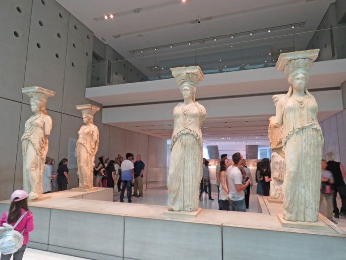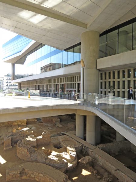 The Acropolis Museum covers a total of 25,000 square meters/269,097.8 square feet.  It was opened in 2009.  The base of the museum is supported by more than 100 concrete pillars so that it appears to be floating over the site’s archeological excavation.  You can see the excavation as you walk towards the museum and even inside the museum as many of the floors are clear glass so you can see the ancient construction. A new exhibit is currently being worked on so that visitors will be able to walk on the ancient roads and stroll along the remains of ancient homes, baths and workshops, etc. in order to feel the presence of those that lived here over 2000 years ago.  It is already amazing that we are already able to see so much.