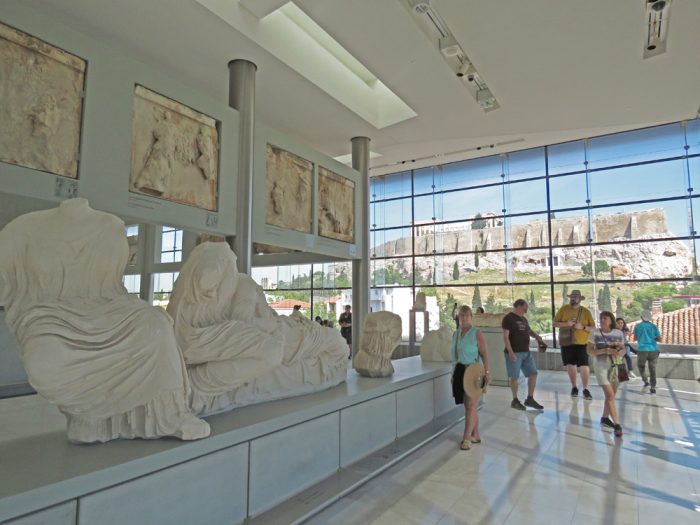 The museum is four stories and thanks to a tip from one of our servers the night before, we started with the best at the top.  The Parthenon Gallery was built to the same dimensions and orientation as the Parthenon.  It was specifically designed to receive and display the entire temple frieze. As you can see the transparent glass walls allow us to see the breathtaking view of the Acropolis, the surrounding hills and the modern city of Athens, all that while being inside and looking at the artifacts.  Impossible to find the words other than stunning and so very special.