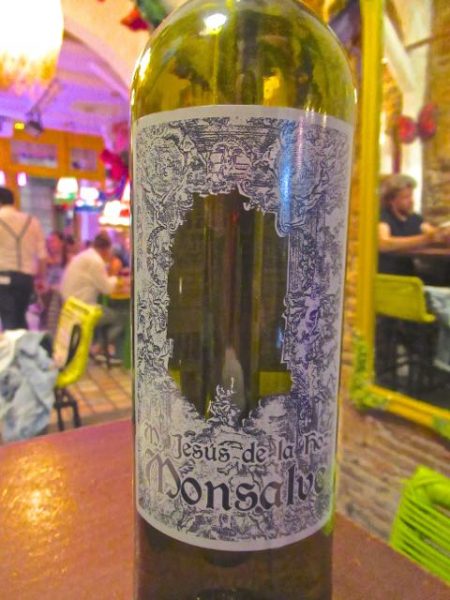 A lovely white Monsalve, Rueda Verdejo, the top line reads ‘M. Jesus de la  Hoz’.   Here is Spain you can buy wine by the glass or by the bottle.  We have yet to run into house wine here in Madrid.  This wine was 3 Euro per glass or 14 Euro for the bottle.  Back in Greece, house wine was sold by the glass or by a 500 ml carafe or 1000 ml carafe. 500 ml usually sold for 5 Euro, so overall much better wine prices.