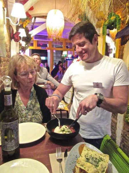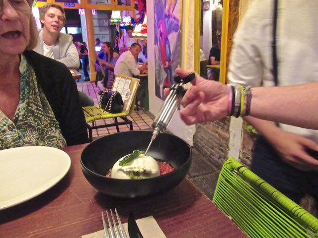 We had a late large lunch ( all that calamari ) so only started with two large tapas. This is Burrata bloody Rossi, goat cheese with pesto and tomato sauce.  Here the waiter is injecting the cheese with pesto.  Can you see the guy over my shoulder?  He ended up ordering everything that we did.