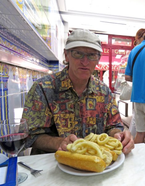 Lunch was a traditional calamari sandwich. Lots of deep fried & lightly breaded calamari on a fresh bun but with no sauce of any kind.  A bit dry but tasty for 3 euro.  I just ate the calamari.  The wine at 2 euro per glass was excellent. We were served by a young lady whose grandfather had established this place.