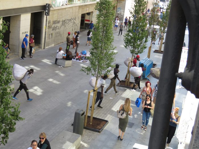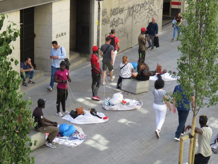 Illegal immigrants from Africa selling their wares on the street.  The items are on a white cloth with ropes attached.
