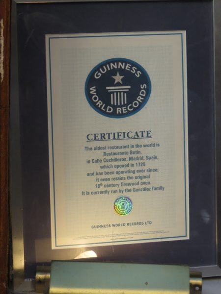 The oldest restaurant on earth, Sobrino de Botin, opened in 1725.  It even has a plaque in the window from GuinnessWorld Records. Hemmingway mentions this place in his novel ‘The Sun Also Rises’.