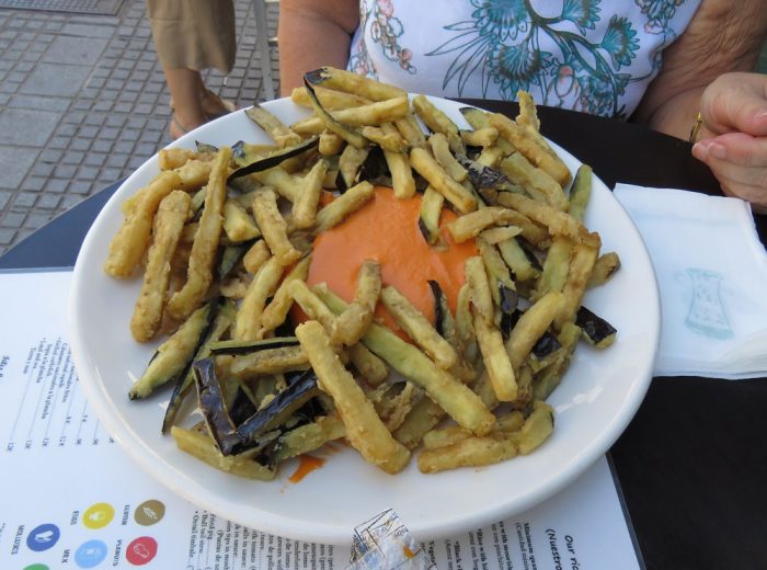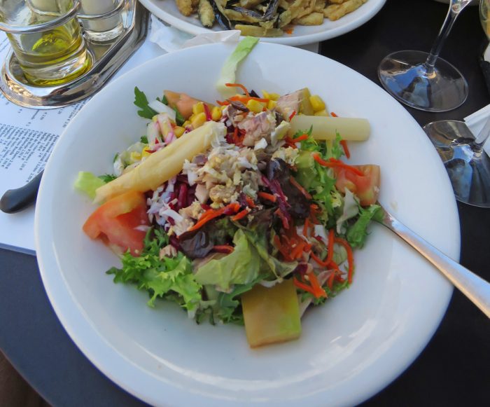 Thinking that the half salad would be a typical small lettuce salad we ordered a plate of lightly fried eggplant to share which came with a Spanish tomato & bread sauce. We were unable to eat it all. Great meal. Each city has its own specialties.