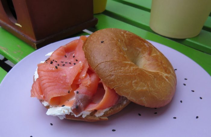 Smoked salmon and creme cheese on a bagel for Colin.