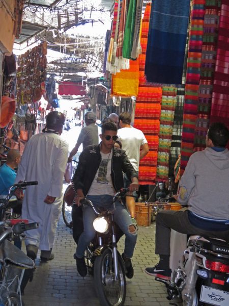 We eased into the day yesterday, our first full day in Marrakech and it was late morning before we got out. Our accommodation is very neat and its enjoyable to just sit inside for a bit. We could hear the call to prayer through our open windows. Our host had indicated that we could pay for things with Visa or Euros. However we are finding that like Mexico cash is what is expected. We changed some Euro into Moroccan Dirham, the rough rate of exchange is 100MAD per 1EUR. Some merchants will accept Euro but give you change back in MAD. We have only found three restaurants that accept credit cards. We spent a good part of the day walking the narrow streets and also walked about Djemaa el Fna and went back later in the evening for sunset and dinner. Very generally I can say that the vendors are very polite and not pushy at all. They try to engage you in a variety of different languages. We are often asked if we are Australian. Everyone breaks out in a huge smile when they find out that we are from Canada. I keep complicating things by speaking Spanish instead of French. My mind is thinking French but my mouth automatically expresses Spanish. Even if I start a conversation in French, half of it comes out in Spanish. Does that mean I am losing my French?