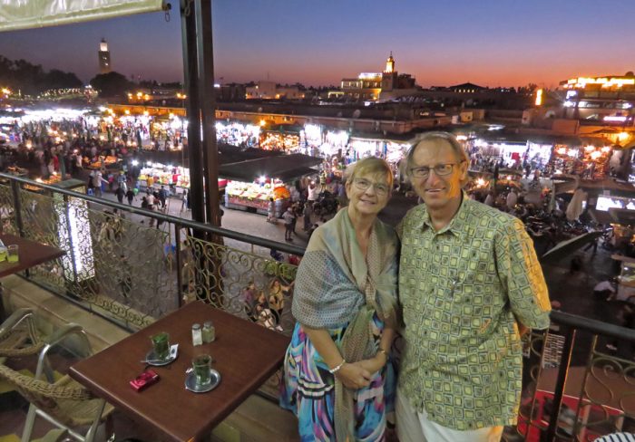 After a brief rest back at the Riad we went back out and found a two story restaurant overlooking Djemaa el Fna. We ordered mint tea. What with all those mint leaves in the cup, it was strong.
