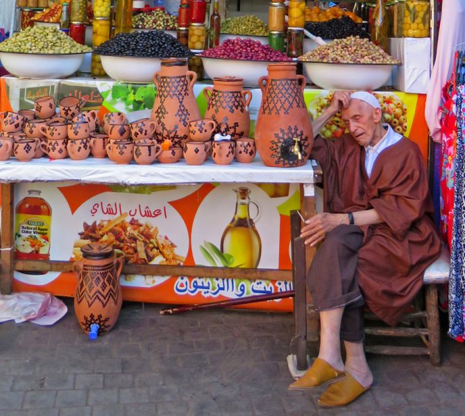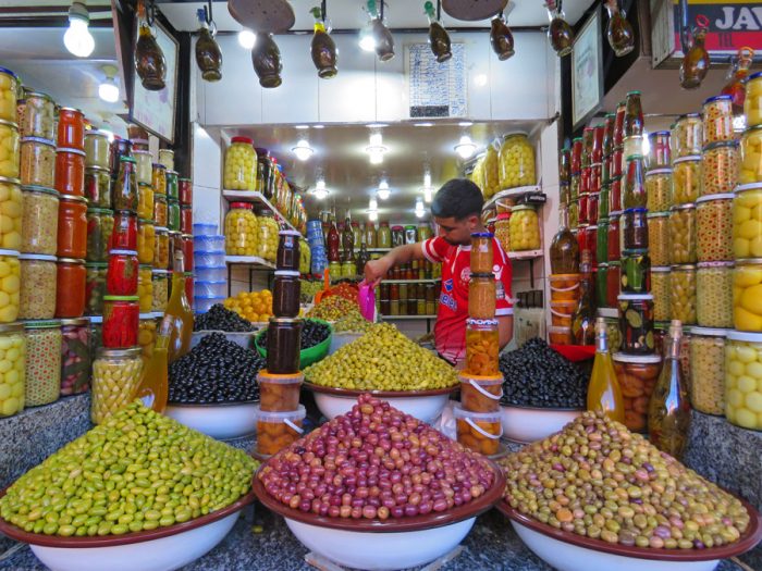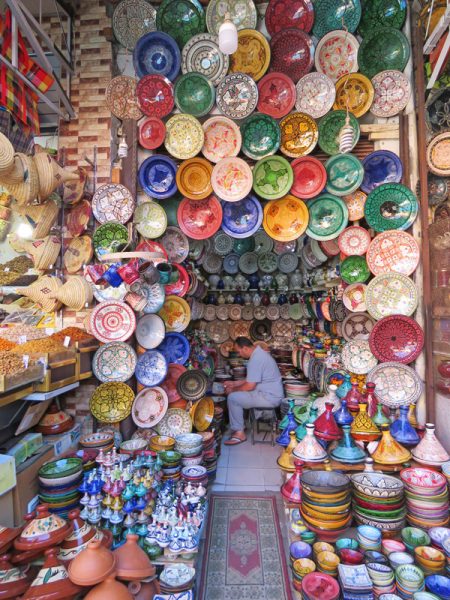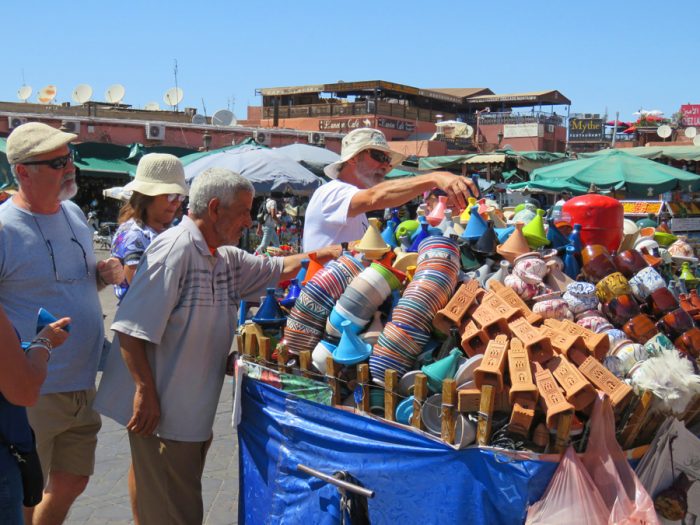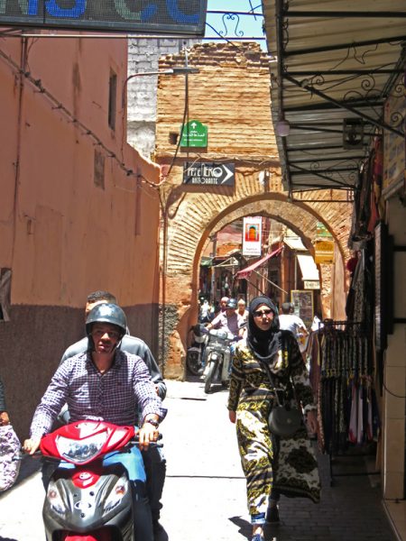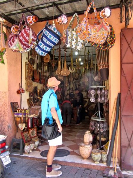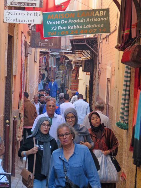 We eased into the day yesterday, our first full day in Marrakech and it was late morning before we got out. Our accommodation is very neat and its enjoyable to just sit inside for a bit. We could hear the call to prayer through our open windows. Our host had indicated that we could pay for things with Visa or Euros. However we are finding that like Mexico cash is what is expected. We changed some Euro into Moroccan Dirham, the rough rate of exchange is 100MAD per 1EUR. Some merchants will accept Euro but give you change back in MAD. We have only found three restaurants that accept credit cards. We spent a good part of the day walking the narrow streets and also walked about Djemaa el Fna and went back later in the evening for sunset and dinner. Very generally I can say that the vendors are very polite and not pushy at all. They try to engage you in a variety of different languages. We are often asked if we are Australian. Everyone breaks out in a huge smile when they find out that we are from Canada. I keep complicating things by speaking Spanish instead of French. My mind is thinking French but my mouth automatically expresses Spanish. Even if I start a conversation in French, half of it comes out in Spanish. Does that mean I am losing my French?