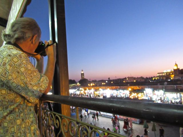 After a brief rest back at the Riad we went back out and found a two story restaurant overlooking Djemaa el Fna. We ordered mint tea. What with all those mint leaves in the cup, it was strong.