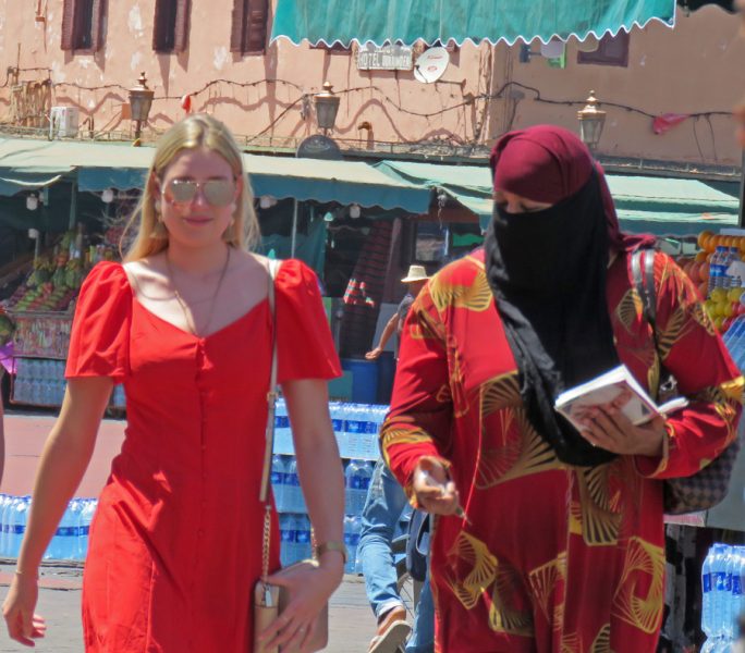 Love the colors! I wonder what the veiled lady was thinking as she was looking at the the woman in the orange dress…great photo.