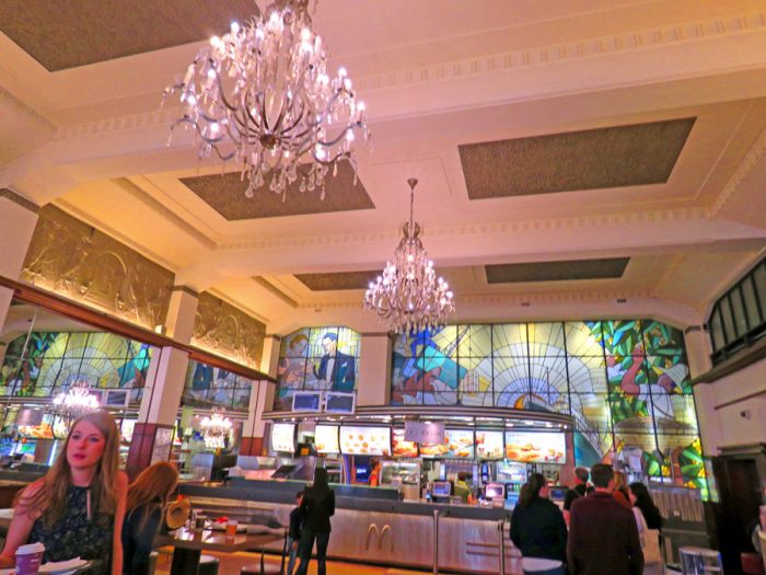 The first McDonalds in Porto is in the business district and was not wanted. They eventually made a deal in 1995, for 30 years, to take over the prestigious Imperial Cafe which had gone broke. They were finally allowed to lease the location provided they did not change the exterior ( other than adding a sign ) nor the interior. So it still has chandeliers and stained glass windows. It is very elegant. What will happen in five years? Chances are that it will revert back to a high end cafe.
