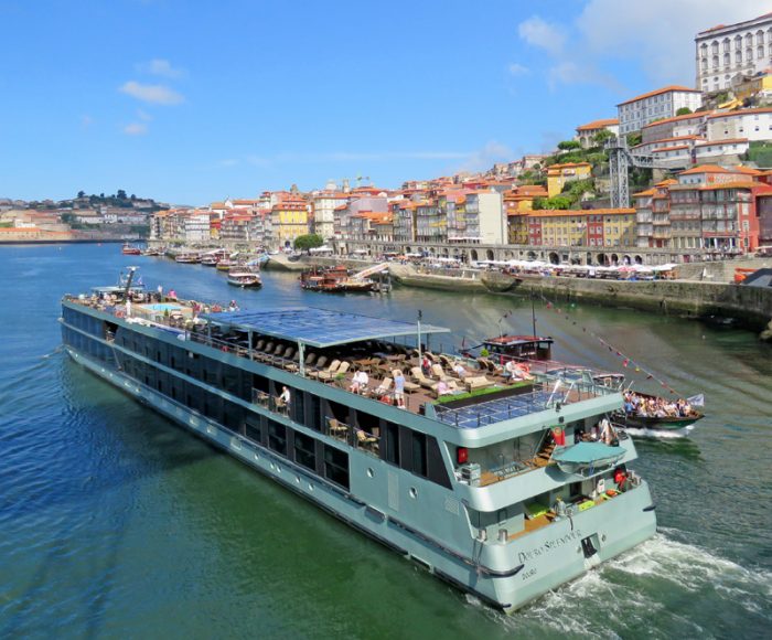 After our leisurely lunch during which I had the pleasure of watching an artist sell five originals, we strolled down to the river. We had no plan and ended up in line to take Tram #1 for a ride along the river to the Foz district. However we waited for close to an hour before it came and we saw that there was only room for perhaps 28 to sit and the rest were crammed in standing.  We had spent a good part of the wait chatting in Spanish with two ladies visiting from Valencia. Colin became concerned that we might have a long wait getting back so we decided not to board. Instead we walked along the river and took the water taxi across for 2 Euro each. We soon found ourselves sharing a table with two ladies from the UK. They told us that they had done the tram earlier that morning and did not think it very special. Cariss was from Wales and lived in ?shire and her friend Melody was from Liverpool, where the Beatles were from. Sorry if I got some names confused. We had a lovely visit as we enjoyed our port.