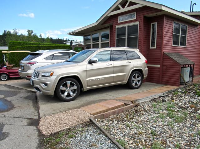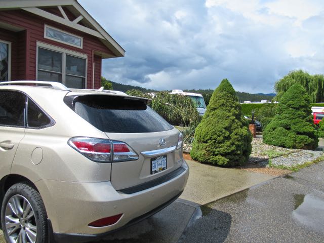 Between my car and the first Alberta tree you see is where Colin parks. The second tree on the right belongs to the yard with weeds. We have a second Alberta spruce to the left of my car at the other edge of our property. They were both here when we purchased this lot.