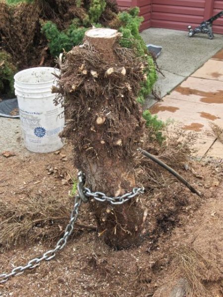 A huge stump. A chain was attached to the stump and to the hitch on the work truck.