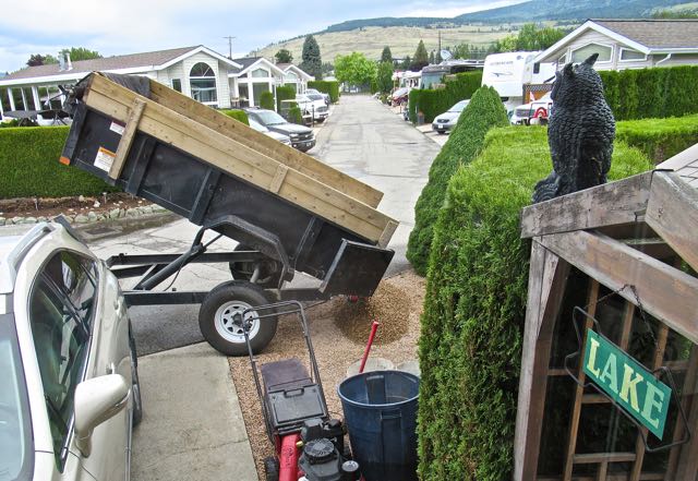 The next phase was adding more Oyama shale aka pink crush to our golf cart parking area. What a neat trailer.