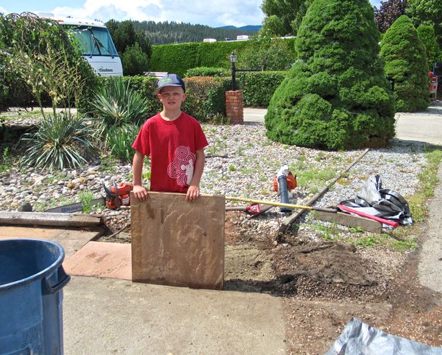 While we did that, W and his son were filling in the hole with sand, tampering it down and then adding two of the four 24″ x 24″ patio stones we had left from when we built the patio.
