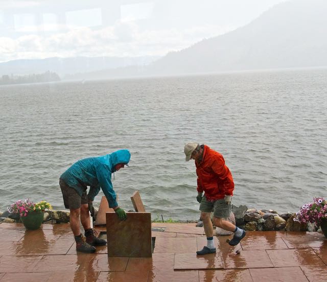 It looked wonderful once they were done. More shale at the road edge and that open area on the left was filled the next day. Walter took one of the patio stones home and cut it to fill the space. Those splotches are the beginning of a heavy rain shower.
