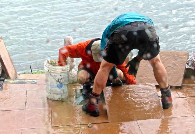 So W did the lifting and Colin did the sanding. It was too wet for me to go outside. By the time they finished the sun came out. It is not quite complete. A few more slabs need to be adjusted.