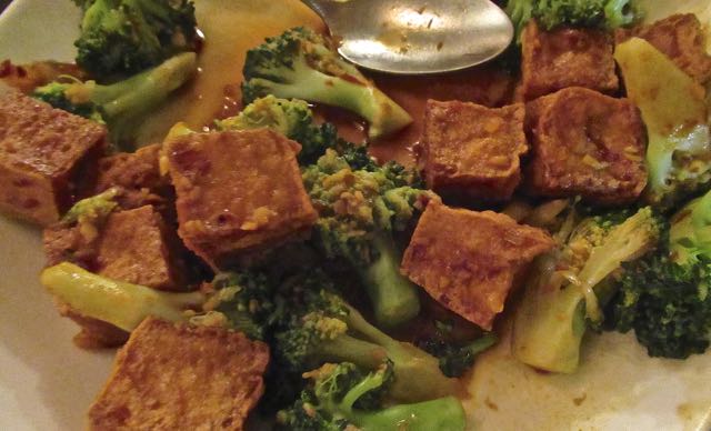 Spicy deep fried tofu cubes stir fried in spicy chilli garlic sauce with onions and broccoli. Hot and spicy!!