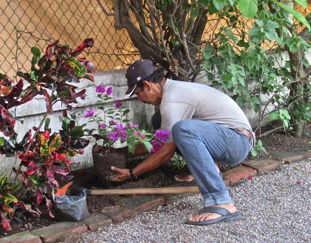 Ismael came and planted our three new bougainvillea. Of course we can mange to do this ourselves but this is a way to give some extra money to him and his family.