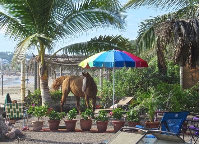 The horse came between our RV and the one beside us and then moved into our yard. It only had about three feet between our green web chair ( on the left ) and the plant pot next to the wall. I had visions of it crashing through our yard back out to the road and destroying our plants.  However it was very polite and left the same way it had arrived.