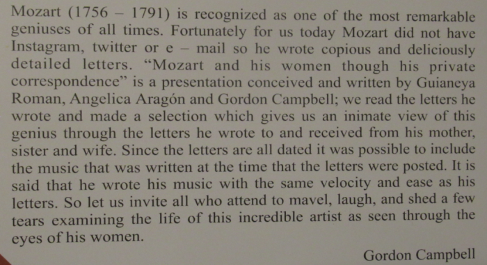 There were snippets of music with a violinist and the piano, as well as the piano and singer and then the piano and quartet. Here Maestro Gordon Campbell is playing the corno or French horn while the narrator is speaking out the actual words that Mozart had had written over the musical notes on this particular composition. In this instance the words were funny as well as naughty meant for Mozart’s friend who played the corno.
