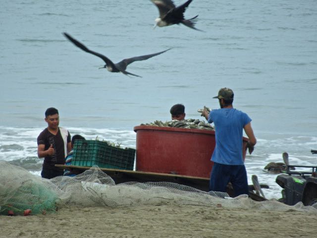 Sunday was dreary but we woke up to a busy beach. I had noticed an ATV pulling a trailer with this large red container earlier. Later we saw them stop out front and haul in an incredible catch. Their net was full and they kept picking fish out of it for close to thirty minutes. Pelicans in the water and frigates in the air. If I could have I would have been right down by the water getting some close ups.