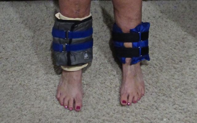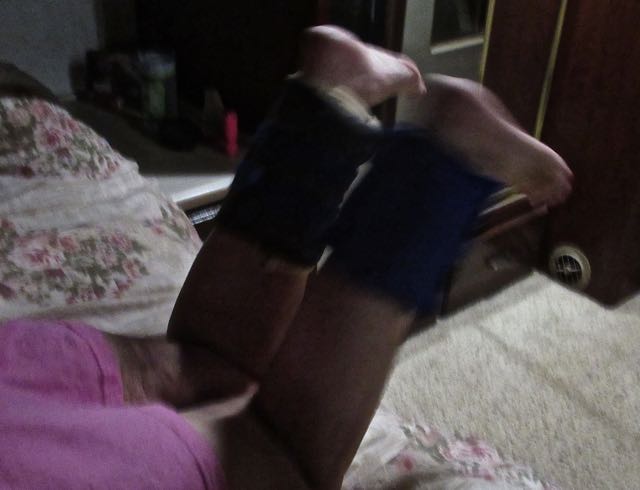 Meanwhile weights have been added to my rehab routine. Hard to believe that I have already had ten physio sessions. As of this weekend I am five weeks post op.  I was fortunate  to be able to borrow the weight on the left from Patrick a, long time blog reader who now winters here on the Isla. It is the perfect ankle weight in that you can add or remove weights from 1 – 5 lbs.  The weight on my left leg ( borrowed from an RVer here in RV1 ), my good leg, is a sold four pounder but it works.