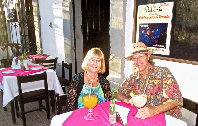 Shortly after 5PM we were sitting on the patio at La Bohemia. I am now trying mango margaritas, so far okay but better than the other. We shared a shrimp Caesar salad as an appetizer.