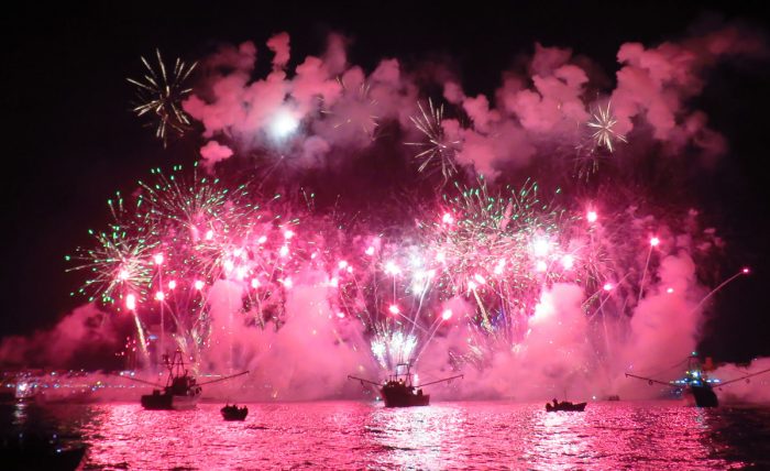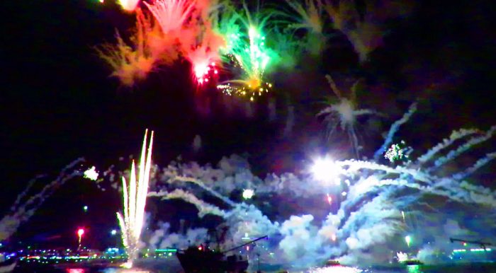 It was a just over thirty minute spectacle. The barges firing off the fireworks are just behind those shrimp boats. As you can see we were right there as close as we could possibly be. The wind was blowing towards shore which made it more difficult for the crowd to see the show.