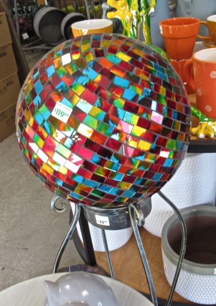 The stand was only $11.99 but the beautiful ball was $119.00. A good price compared to the plaque above but much too fragile in the event of wind.