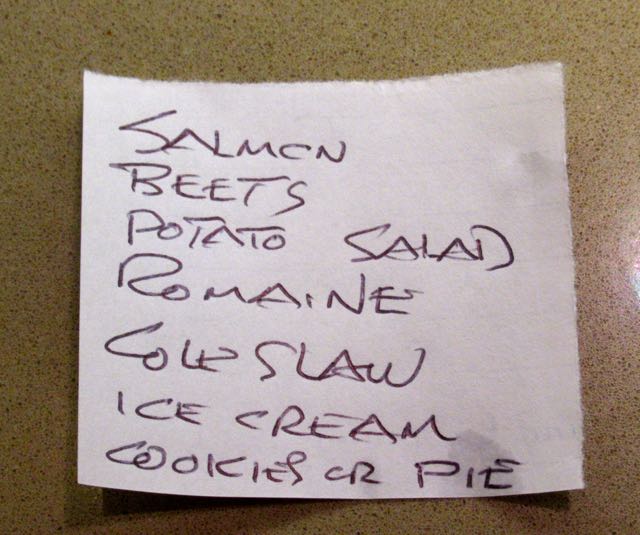 One day I walked into the kitchen and there was our dinner menu. In this case the salmon was a frozen wild salmon patty.