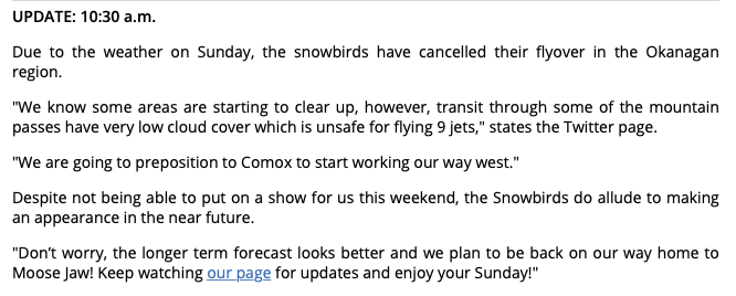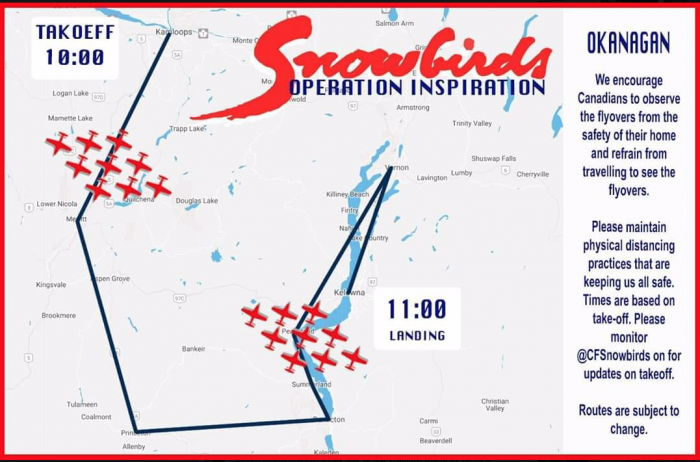 Meanwhile here today in Kelowna a group wanted to get together to honour the tragic death of Captain Jennifer Casey by doing a Snowbird Tribute flyover. They did a single line formation of 10 aircraft and two helicopters. You can read about it by clicking here. Pilots in the Vancouver area did the same thing with forty aircraft at 6PM tonight.