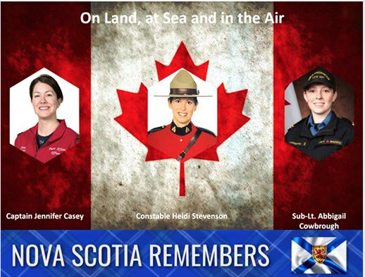 On Land, at Sea and in the Air. In less than a month Canada has mourned the tragic loss of three courageous and patriotic Canadian women who died while proudly serving their country. All hailed from our beautiful sister province of Nova Scotia and to all of their families and friends in the Maritimes and across the country, we grieve with you as a nation. We will always remember Constable Heidi Stevenson, RCMP, Sub Lt. Abbigail Cowbrough, Navy, and Captain Jennifer Casey, RCAF.