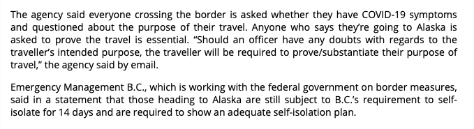 Today’s latest news article related to my post two days ago.  So now Americans are expected ( always have been!!! ) to spend 14 days in quarantine once they cross into Canada (at least in BC ), before continuing onto Alaska.