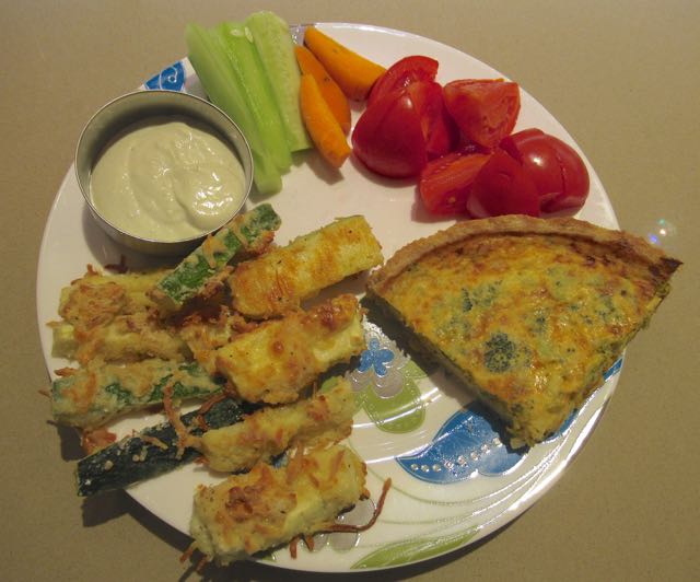 We continue to eat well. I made baked zucchini fries with a mayo/wasabi dip, the zucchini, cucumbers, tomatoes and carrots were from our garden. Easy meal to prepare with a piece of quiche from Costco.