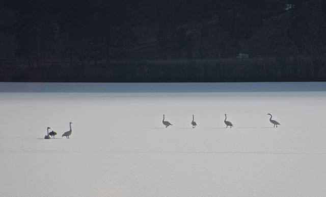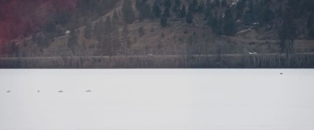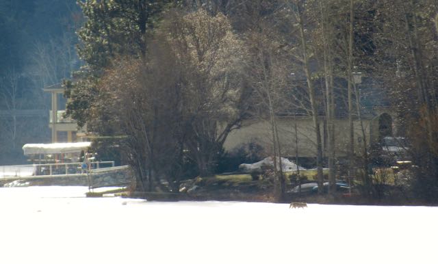 No one else on the lake except for some Trumpeter Swans ( mid left ) which we heard as they came in to land.  That was a thrill. The tiny black dot on the right of the shot, in the white section, is a coyote.