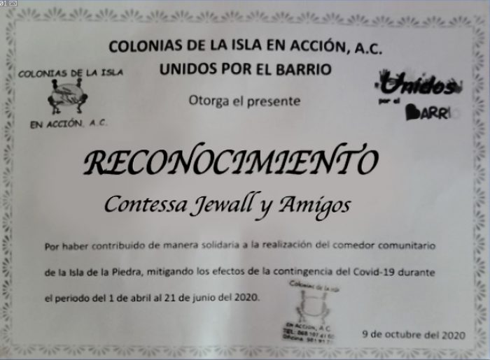 This is a photo of a reconocimiento /certificate of recognition that I was awarded ( me and my friends – those that contributed ) to help the people in need of food on the Isla from April to July because of Covid. It is issued from the Colonias Association on the Isla. I was so humbled to receive this. The actual certificate is somewhere on the Isla. Hopefully I will catch up to it eventually.