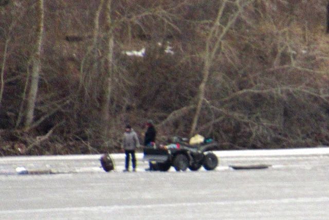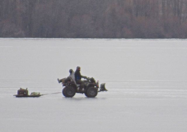 Shortly after we finished disinfecting our groceries and putting them away I caught movement on the ice. An ATV with a snow plow in front towing a toboggan with what looked like a fire pit. I  hope that they were not dumping the wood or whatever they were burning into their ice fishing hole.