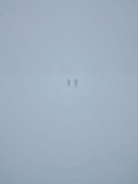 Skaters going down the lake in the midst of snow flurries this morning. We could barely see them.