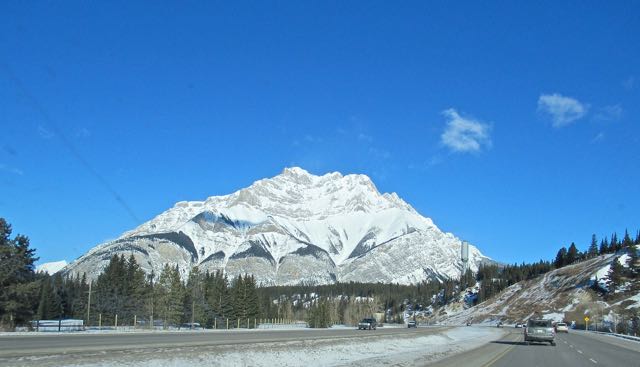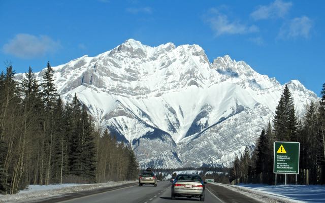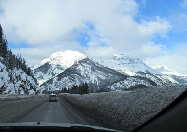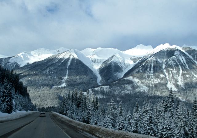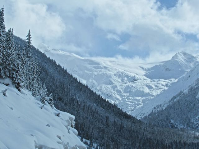 We were stopped just before Rogers Pass for more avalanche control or as the fellow said “they are dropping the bombs today”. We actually heard one loud boom. Fresh snow on the pines and hoar frost on the others.