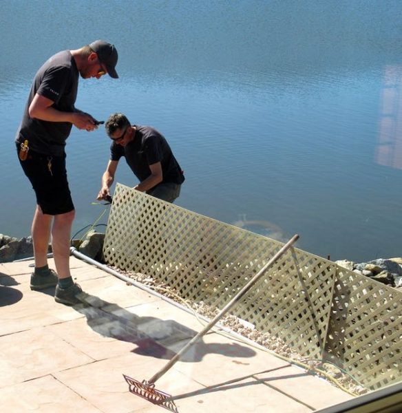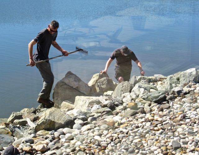 You will recall that we have been without a landline phone for close to six weeks. We paid to have new conduit installed and Colin helped with the labour.  Our cost was $200.00. These are the two Telus fellows assigned to pull the phone line through the conduit and hook it up to our house. They were fooling around and by accident tossed their electrical tape in the lake. Colin saved the day with a rake.