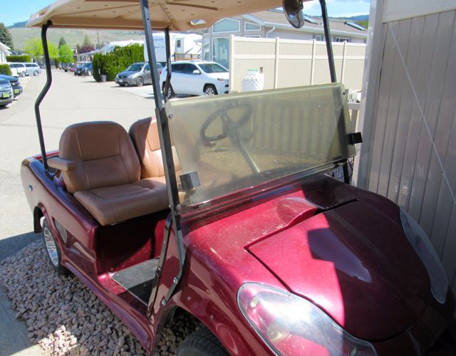 There was only one new windshield that would fit our cart in all of Kelowna and fortunately Colin was able to locate it. It took both Colin and our neighbour Bob to fit it properly. You can ( with difficulty ) see how much clearer it is – and that is with the protective film still on it. Finally we can see clearly again!