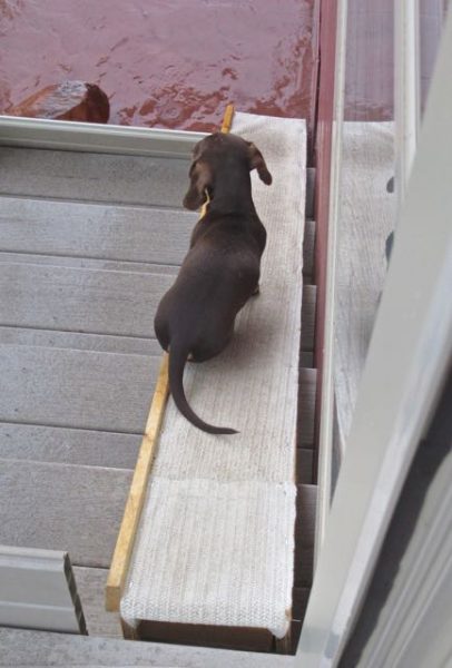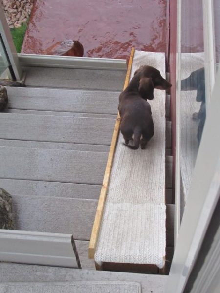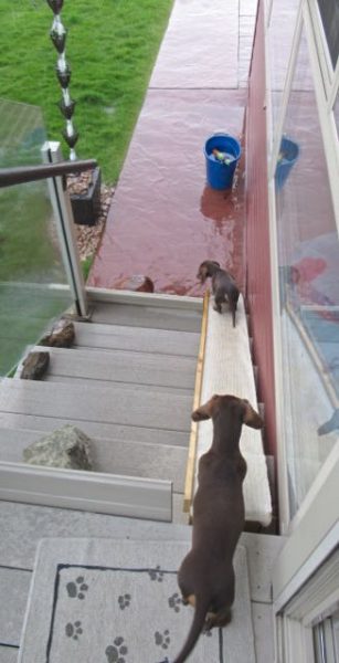 Almost there. You would think that it would be easier to step off the ramp and come back up properly. This is an instinctive behaviour. How many puppies/dogs can back up a ramp?