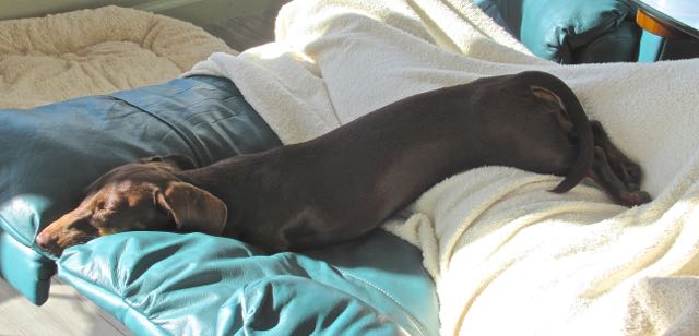 Such long dogs, this is Ciela. Her rear is higher up over my legs under the white blanket then her head is.
