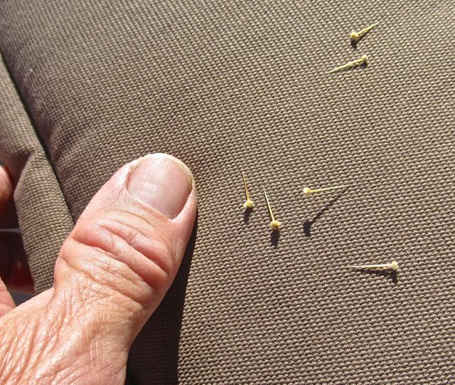 Most were fully embedded right to the flower tip. Looks to be between 1/2 – 3/4 of an inch.  Poor puppy.  I had an analgesic antibiotic that I sprayed onto her foot ( the entry points were bleeding just a tiny bit ). She than lay for over an hour next to Colin under piles of blankets and dozed off and on.