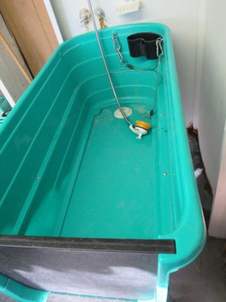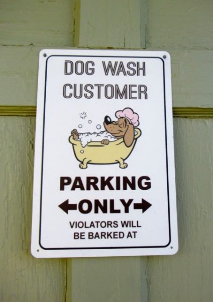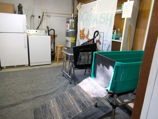 A full dog spa! I have never ever seen anything like this. The green tub with hot and cold, a table with a hair dryer and a washing machine just for dog stuff so that the hair does not get into the people washers.  Off the the left they even had a huge plastic apron ( covered in a dog bone print ) so you stay dry.